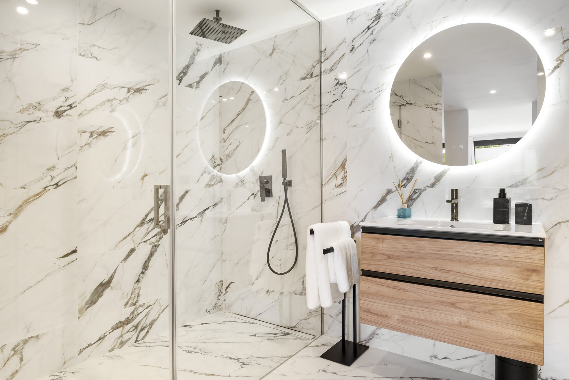 De villa is ontworpen volgens de hoogste normen en beschikt over vier goed geproportioneerde slaapkamers en vier moderne badkamers, wat zorgt voor voldoende comfort en gemak voor zowel familie als gasten. De strakke, open keuken stroomt moeiteloos naar de uitgestrekte woonkamer, gemarkeerd door vloer-tot-plafond ramen die een heldere en uitnodigende ruimte creëren. Deze grote ramen overspoelen niet alleen het interieur met natuurlijk licht, maar bieden ook directe, naadloze toegang tot de privé-terrassen, waardoor u moeiteloos buiten kunt leven. De villa beschikt over een volledig ingericht interieur met vloerverwarming, airconditioning, dubbele beglazing en aerothermie om het hele jaar door comfort te garanderen.