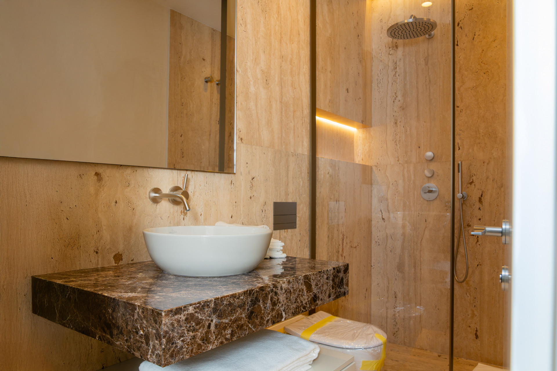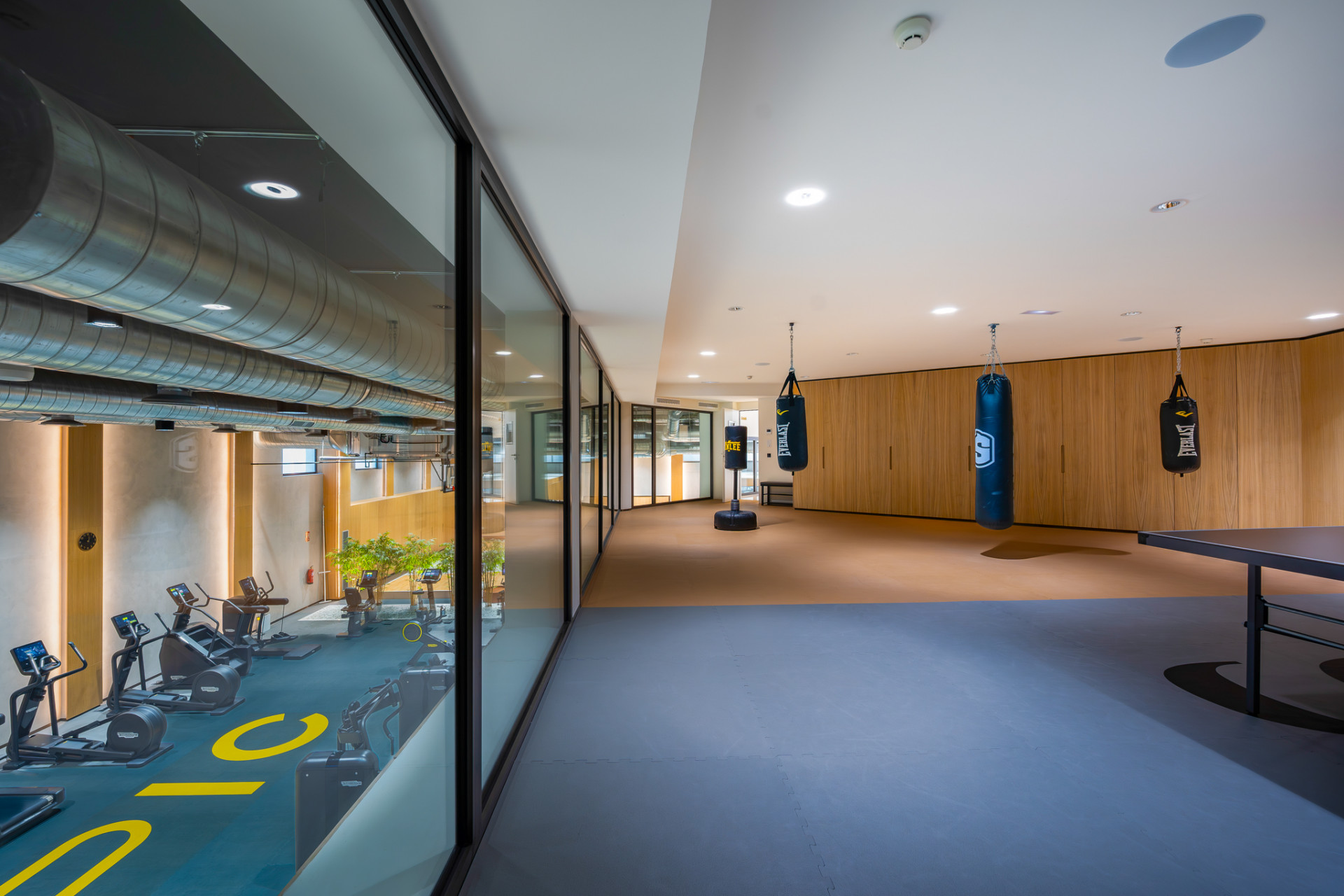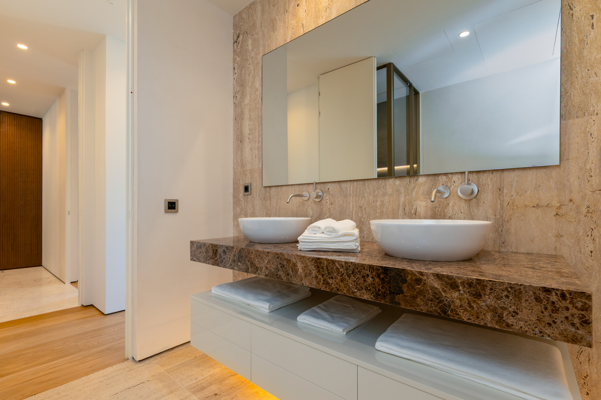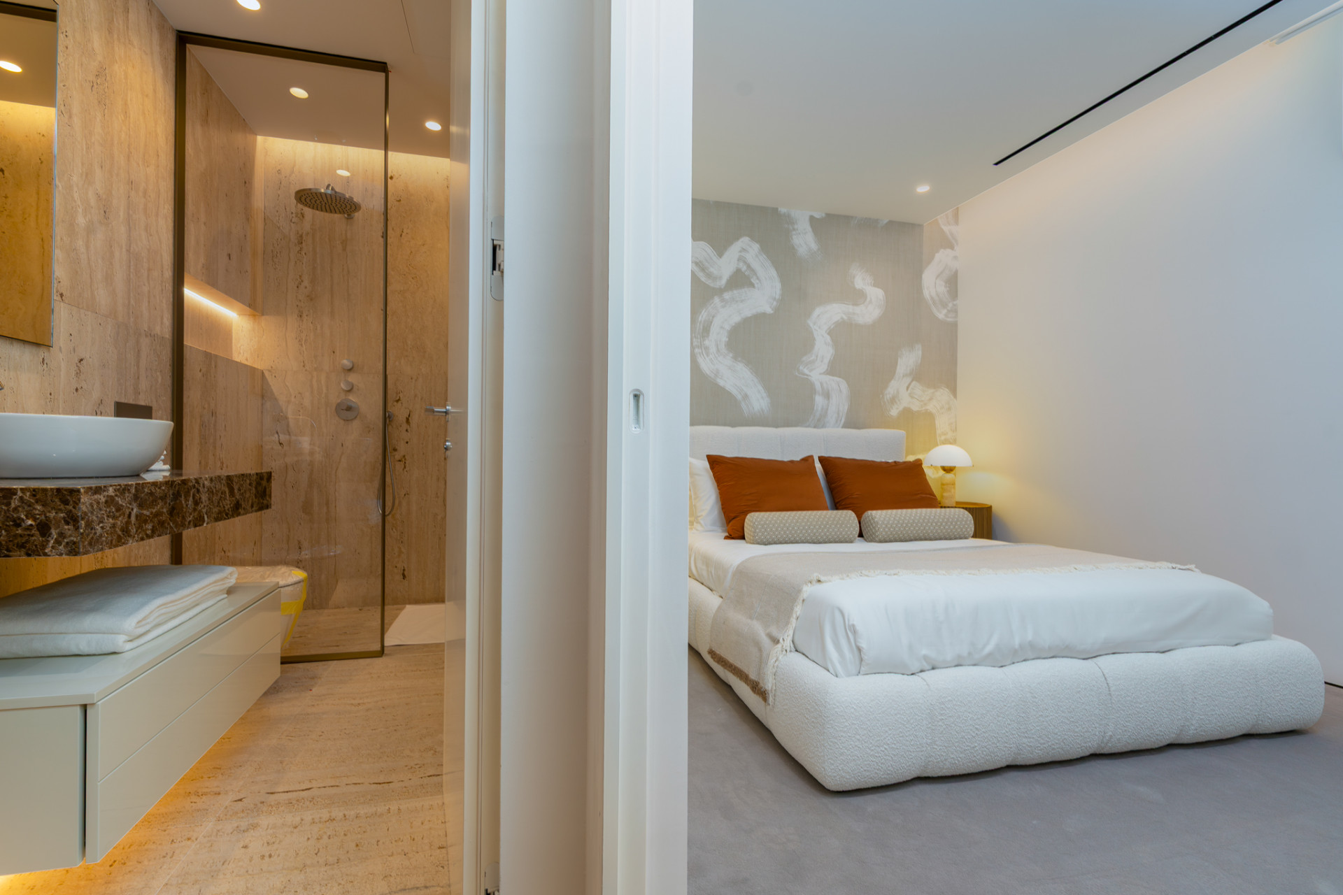 The property features four spacious bedrooms, each with stylish en-suite bathrooms, and an additional guest toilet for convenience. The master suite, located on the ground level, opens directly onto the private terrace and boasts a luxurious bathroom fitted with a double vanity, bathtub, and separate shower. Two further bedrooms with en-suites complete this level, while the basement offers an additional bedroom and bathroom, plus an expansive multipurpose space ideal for a games or cinema room. Every element—floor-to-ceiling windows, underfloor heating in bathrooms, air conditioning, double glazing, and a walk-in closet—contributes to an ambience of quality and comfort.