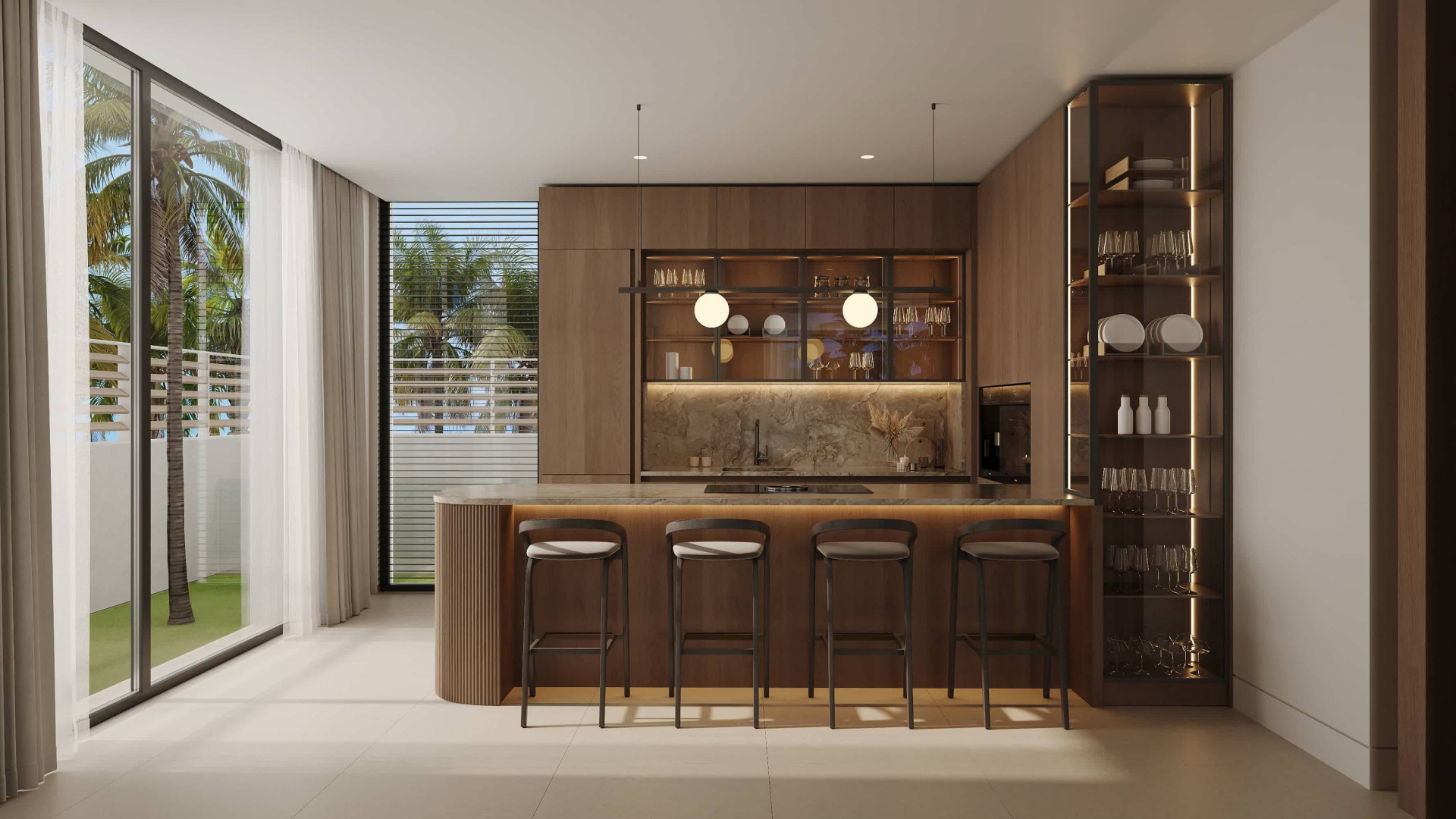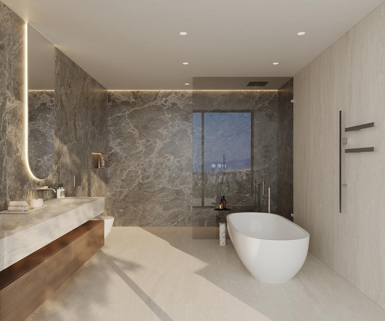 On the upper level, three further bedrooms each feature private en-suite bathrooms, with the main suite benefiting from a walk-in wardrobe. The solarium crowns the villa, offering 360-degree panoramic views of the sea, mountains, gardens, and the neighbouring community. Designed for entertaining and relaxation, it is equipped with jacuzzis, sun loungers, an al fresco dining area, and a fully fitted outdoor kitchen—ideal for savouring the Mediterranean climate.