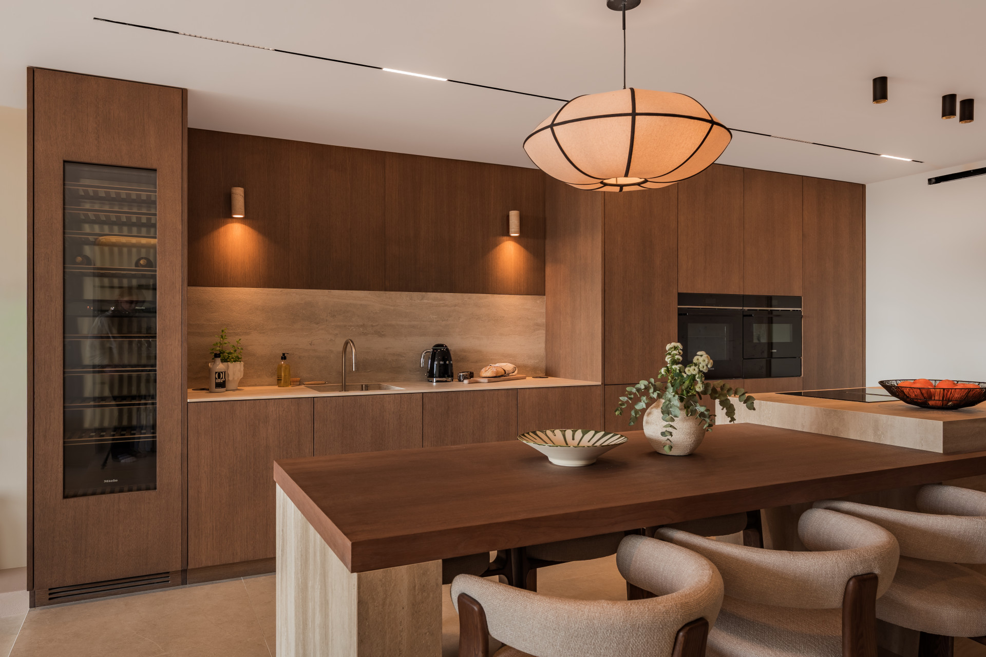 Meticulously renovated, the townhouse spreads elegantly over three levels, offering a generous built area of 220m² with 150m² of stylish interior space and an expansive 70m² of terraces. The heart of the home features a bright and airy open-plan living and dining area complemented by a fitted open plan kitchen, seamlessly connecting with the outside through glass doors. This design promotes a sophisticated indoor-outdoor lifestyle, with a private sun-soaked terrace equipped with lounge seating and decking, ideal for enjoying the region’s enviable climate and panoramic views of the mountains and surrounding gardens.