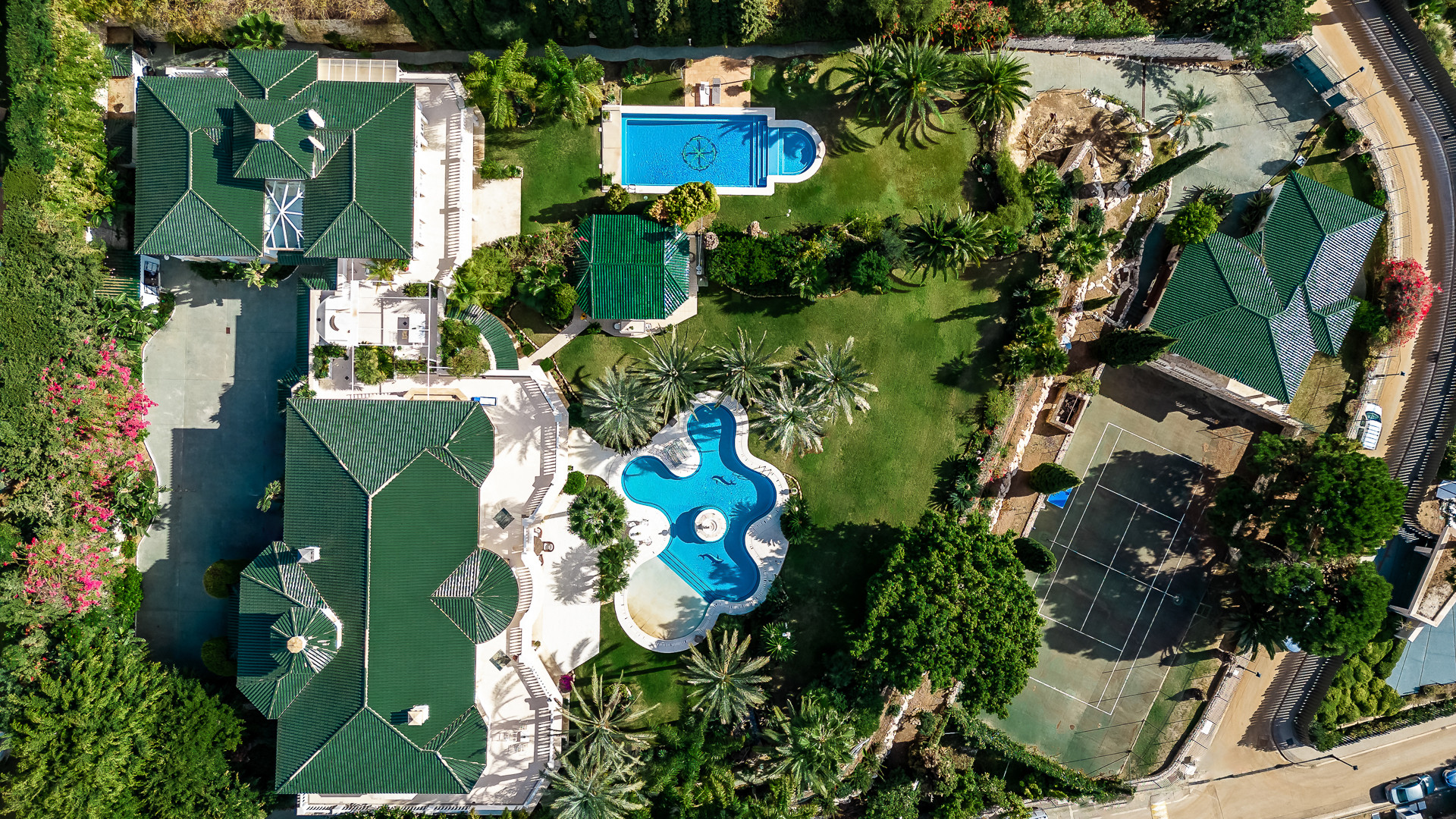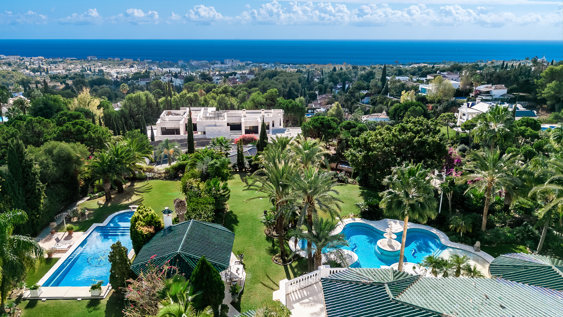 This exceptional villa is situated in the prestigious Cascada de Camojan, nestled within the renowned Marbella Golden Mile. Spanning an impressive 7,200m² plot and offering a luxurious built area of 2,100m², this property provides a unique combination of elegance, exclusivity, and Mediterranean lifestyle, just 10 minutes from Marbella town centre and the beach. Featuring a total of 14 bedrooms, the estate comprises three distinct residences: a main house with four bedrooms, an adjacent guest house with seven bedrooms connected to the main residence, and a separate detached guest villa with four bedrooms, ensuring ample privacy and flexibility for owners and visitors alike.