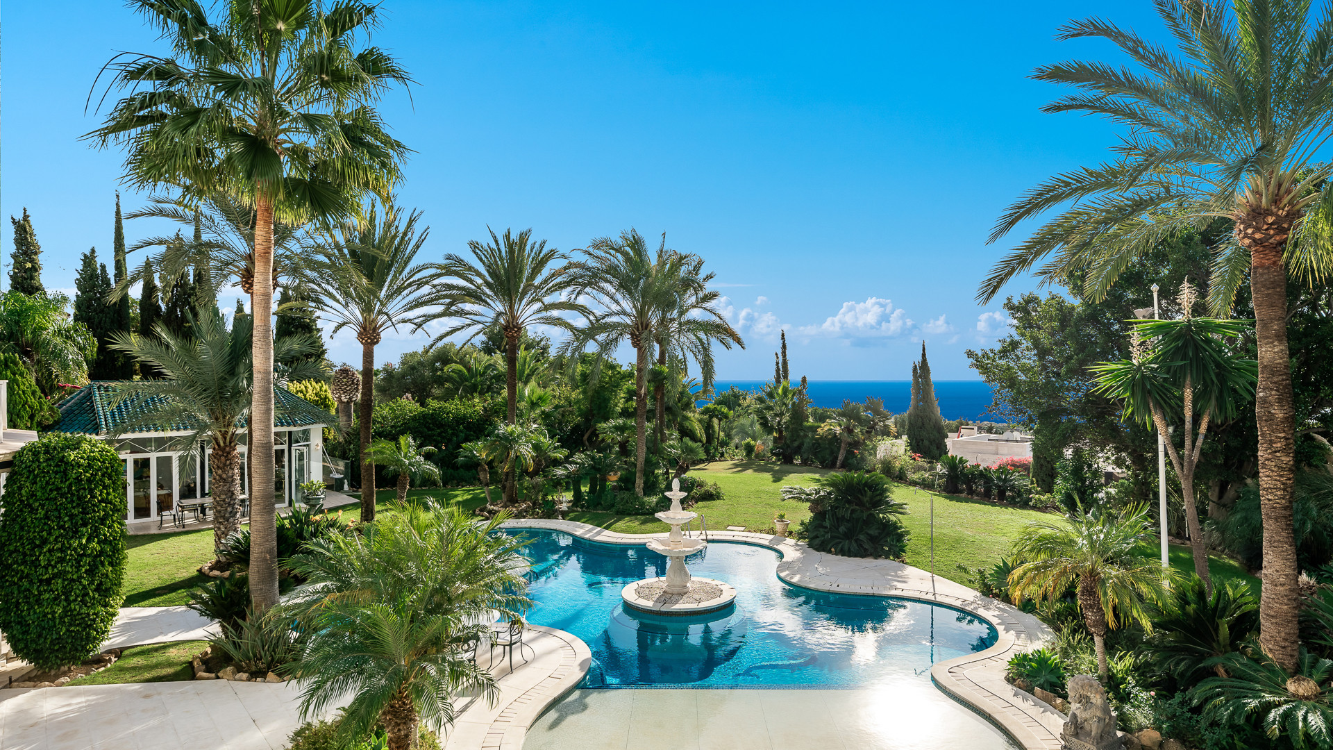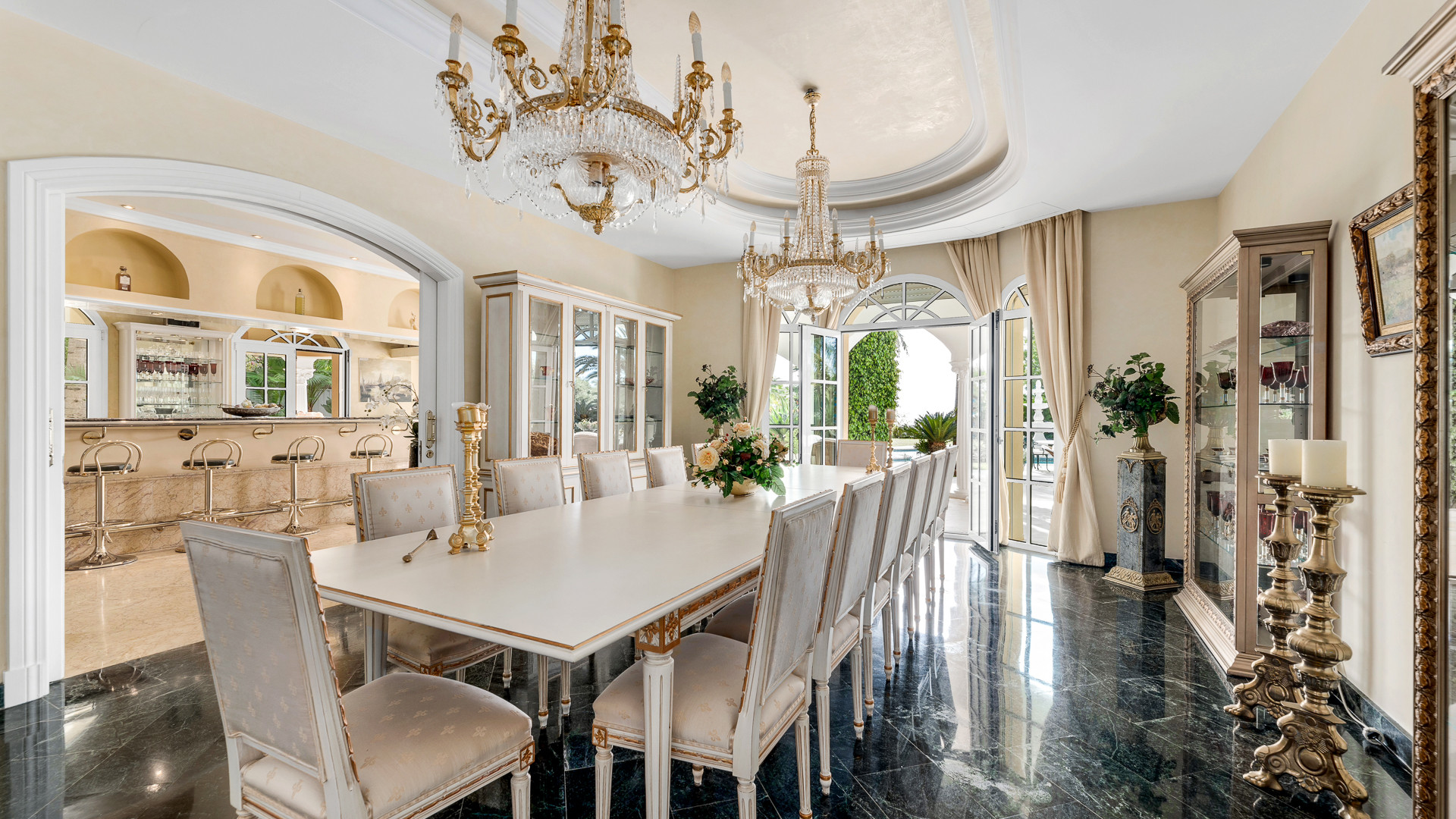 The villa boasts expansive interiors, with 1,500m² of refined living space crafted to the highest standards. The fully fitted kitchen is complemented by a spacious dining area that accommodates up to 12 guests, while multiple living areas enjoy mountain, sea, and panoramic views. The property is equipped with advanced amenities, including air conditioning, underfloor heating throughout, a fireplace, a laundry room, a dedicated office, and a comprehensive alarm system. The wine cellar, gym, games room, and both indoor and outdoor bars further enhance the offering, embodying a residence designed for both relaxation and sophisticated entertaining.