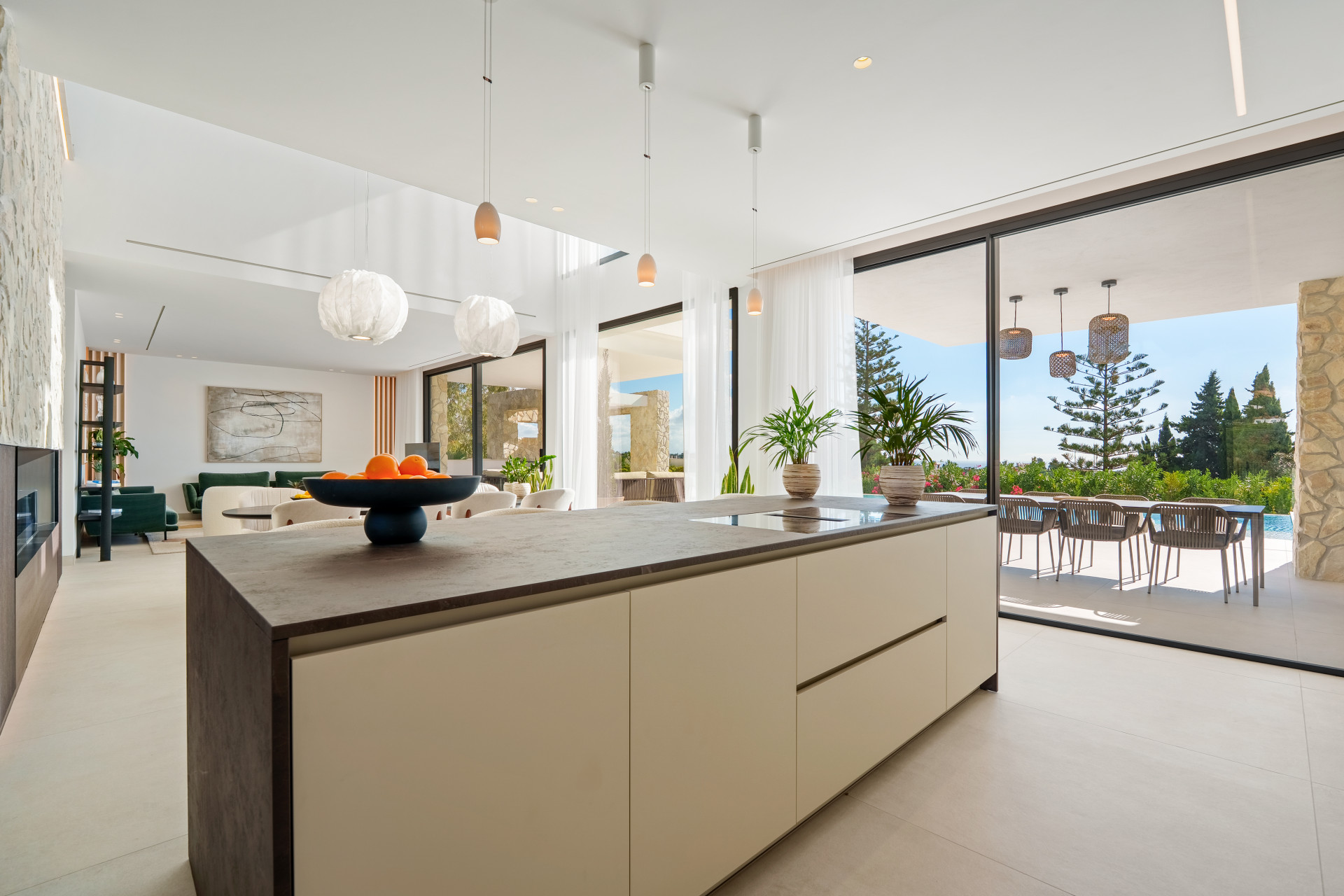 Spread over a generous 1,210m² plot, with a built area of 606m² and an impressive 307m² of terraces, the villa comprises five bedrooms and four bathrooms, plus a separate guest toilet. The spacious master suite features its own private terrace, a dressing area, and breathtaking vistas, while additional guest rooms are thoughtfully positioned for privacy and comfort. The open plan living and dining area boasts floor-to-ceiling windows which flood the interiors with natural light, enhanced further by sleek glass doors and contemporary finishes throughout. Clean architectural lines, double glazing, and an excellent state of repair contribute to an atmosphere of understated sophistication.