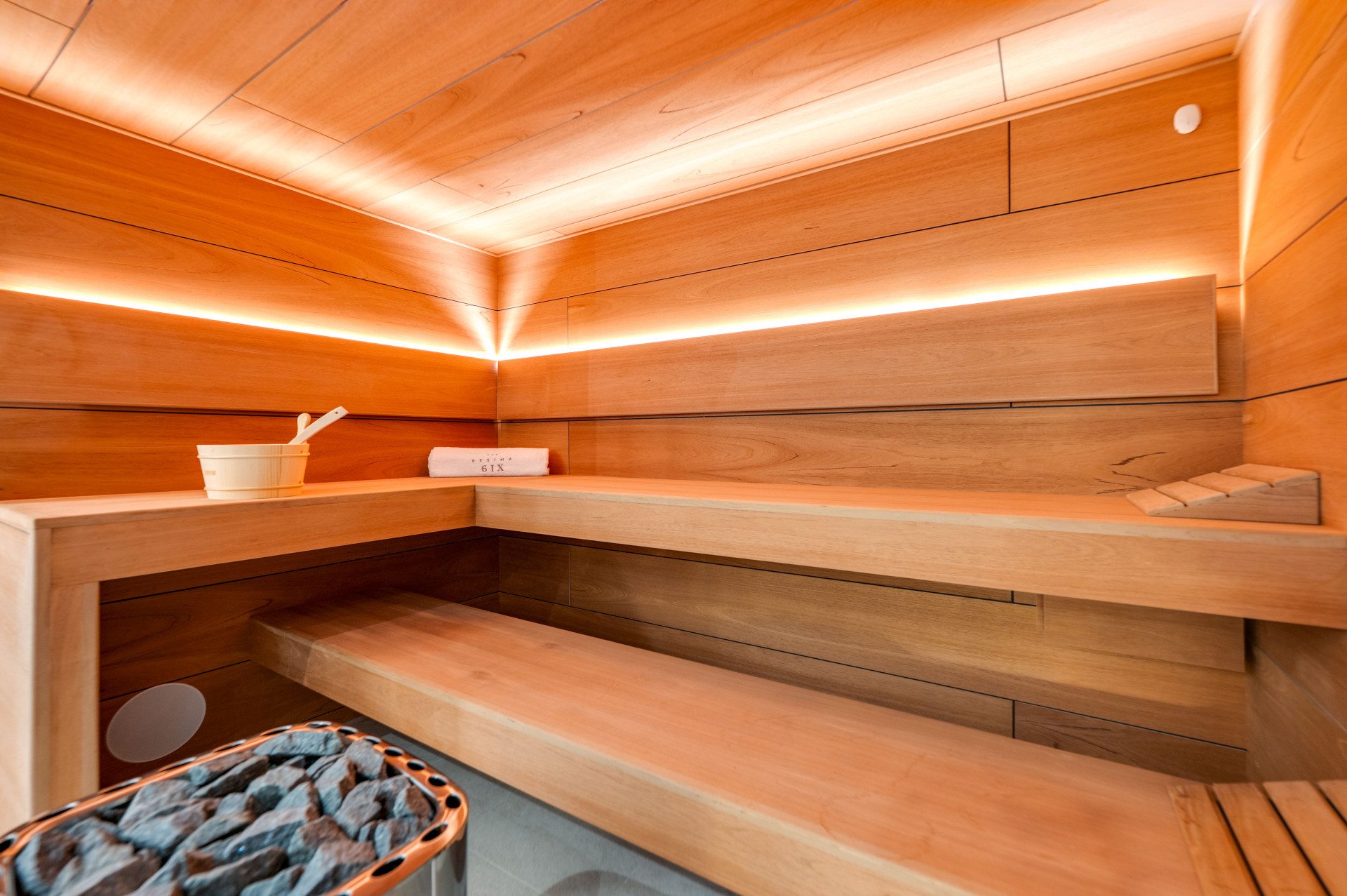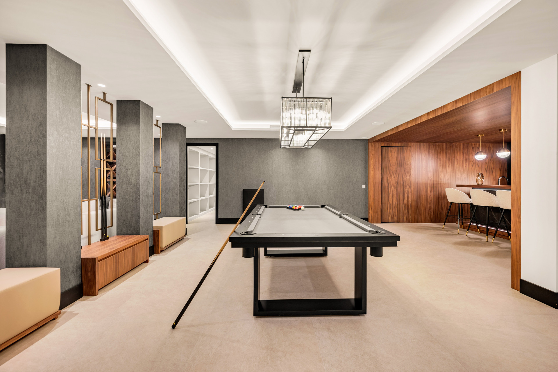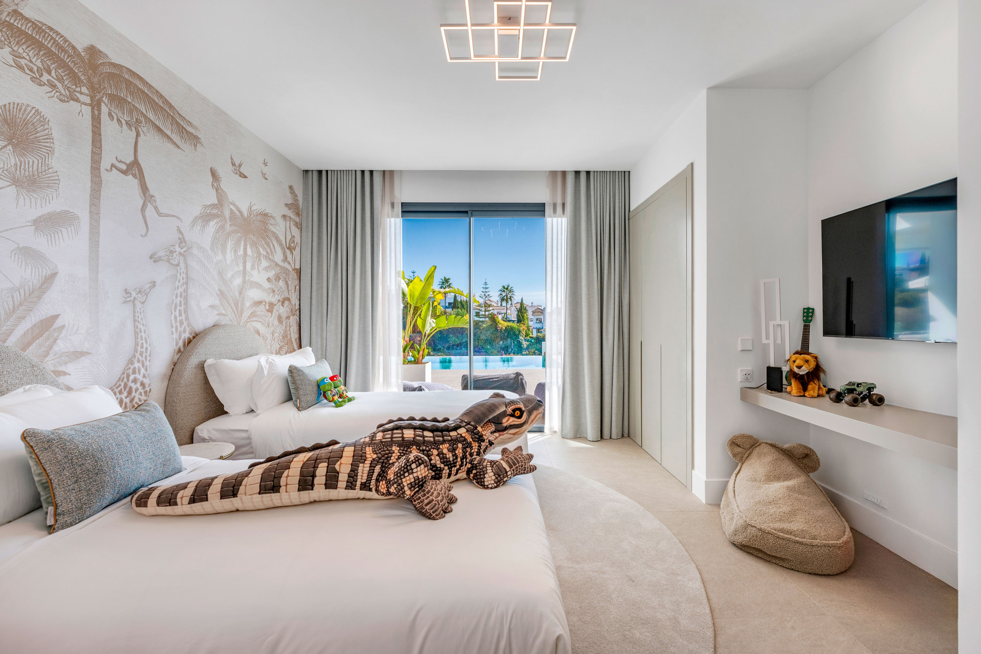 The master suite occupies the upper level, affording privacy and luxury with its generous terrace, walk-in wardrobe, and en suite bathroom. This sanctuary is enhanced by a second en suite bedroom and an inviting TV lounge. Descending to the lower floors, the villa features further living spaces including a sophisticated bar, games area, spa zone with sauna, gym, Turkish bath, and two additional garden-level bedrooms. The outdoor experience is completed with extensive private terraces, a solarium, jacuzzi, and a meticulously landscaped garden overlooking the private swimming pool, all presenting yet more vistas and sun-soaked relaxation.