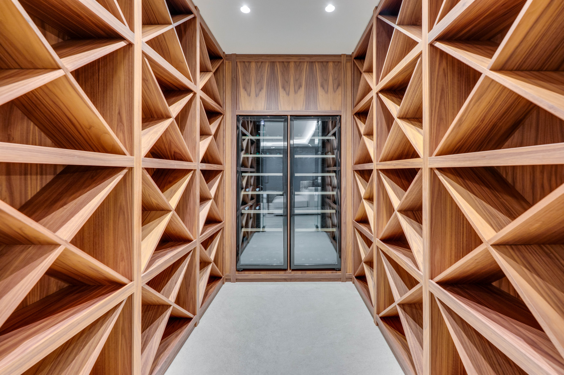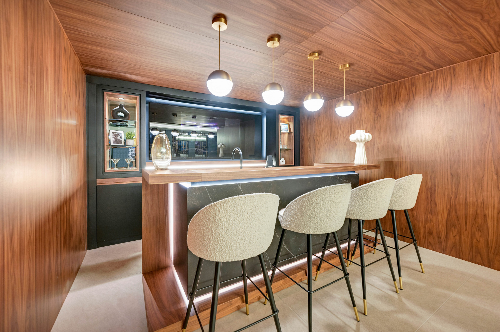 The expansive property covers a plot of 1,006m², with 674m² built and 503m² of refined interior space. The bold, four-level structure welcomes residents via a sweeping driveway to the top floor entrance. The main floor serves as the hub of the home, featuring an open-plan living and dining area with remarkable floor-to-ceiling windows, flooding the space with natural light and framing panoramic views of the Mediterranean Sea, golf course, mountains, and countryside. The state-of-the-art kitchen is fully fitted with premium appliances and a secondary prep area, complemented by a modern wine cellar and integrated sound and smart home systems throughout. Two guest suites are conveniently located on this principal level.