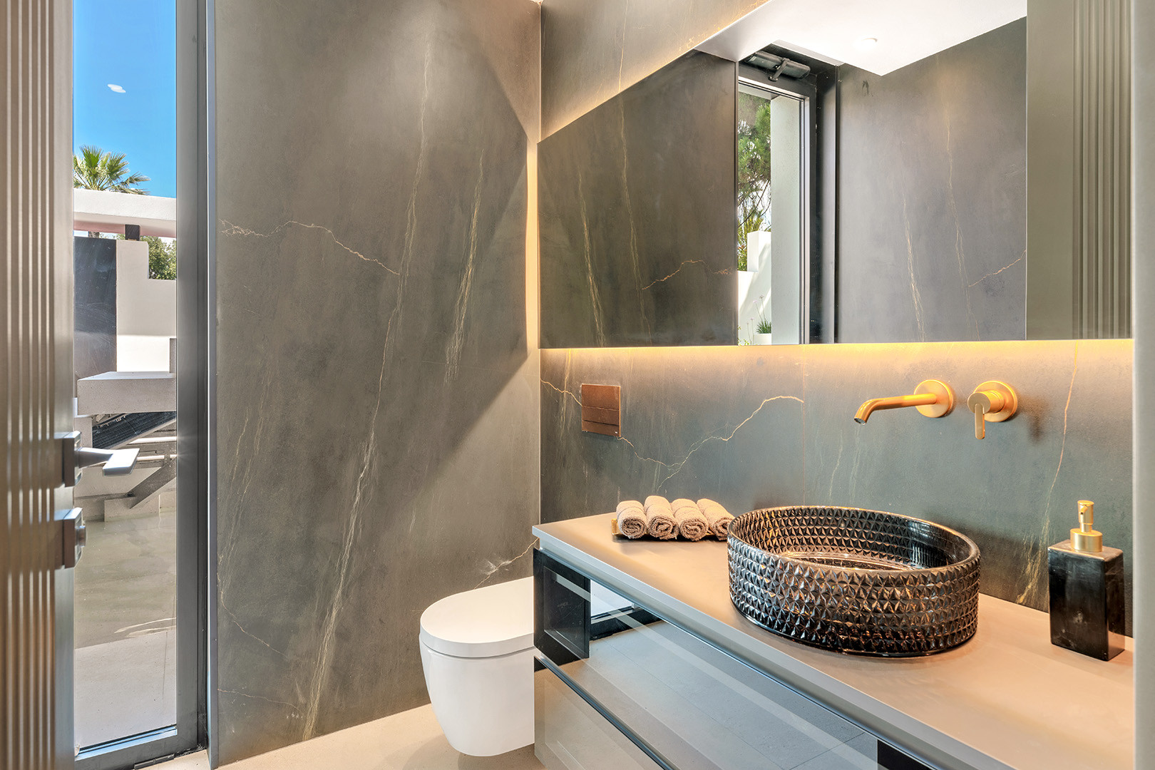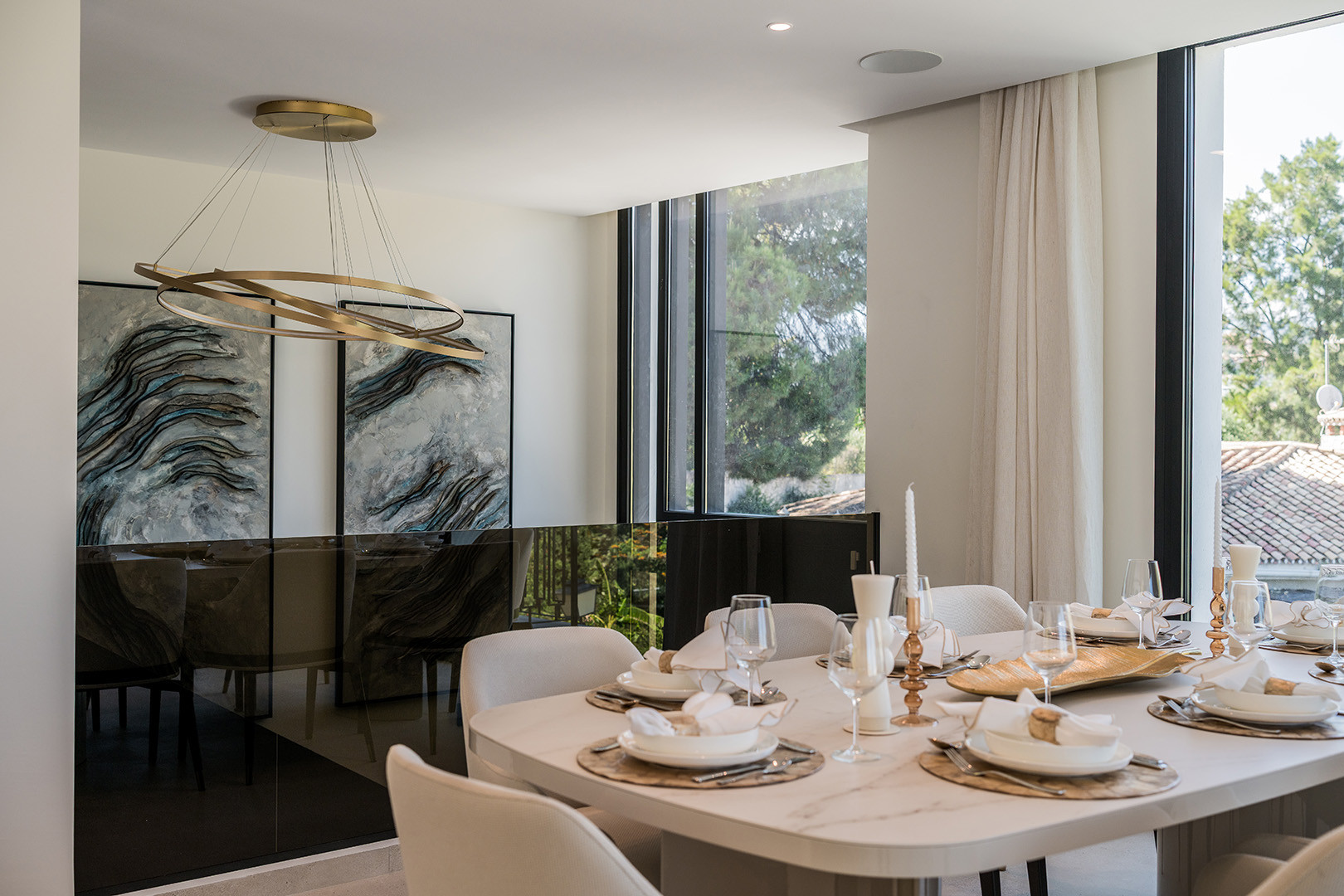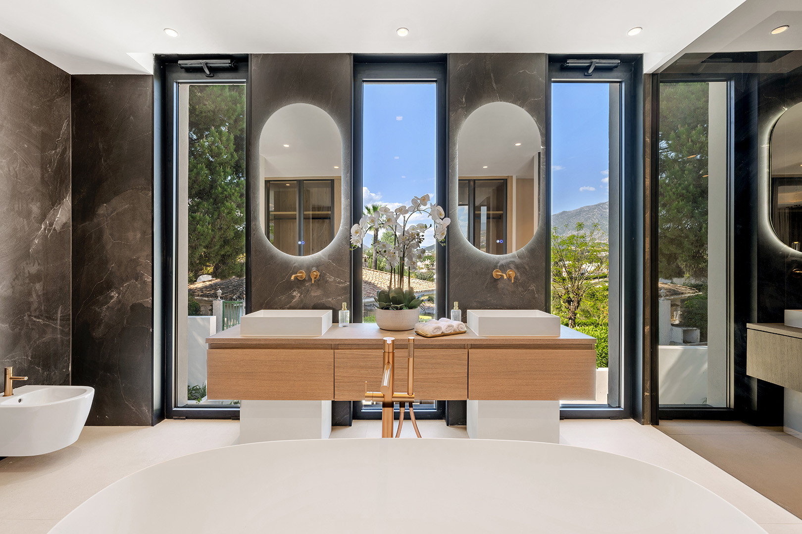 Resting on a generous plot of 882m² with a built area of 442m², this home reveals an impeccably designed layout of four spacious bedrooms, all boasting en-suite bathrooms, alongside two additional guest toilets. The master suite is a true retreat, featuring a free-standing bathtub and double vanity basin. The expansive open-plan living and dining area benefits from large ceiling-height windows, flooding the space with natural light and maximising panoramic views of the iconic La Concha Mountain and the surrounding golf courses. Designed for seamless indoor-outdoor living, the kitchen comes fully equipped and transitions perfectly to a series of covered and uncovered terraces, inviting residents to enjoy Marbella’s superb climate and refined lifestyle to the full.
