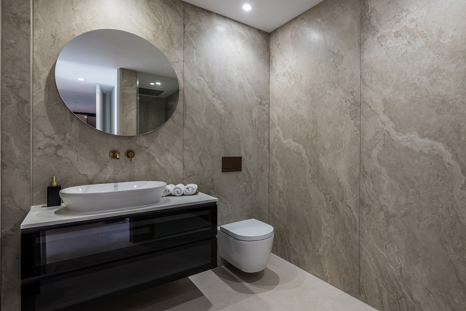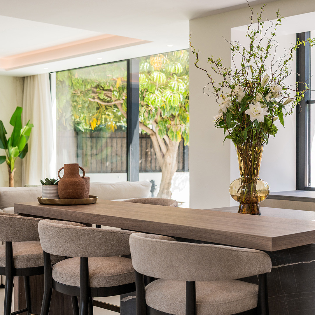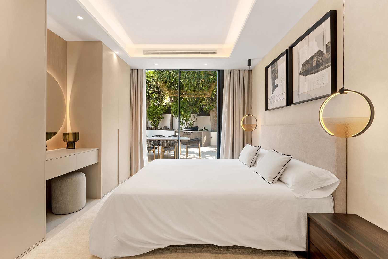 Resting on a generous plot of 882m² with a built area of 442m², this home reveals an impeccably designed layout of four spacious bedrooms, all boasting en-suite bathrooms, alongside two additional guest toilets. The master suite is a true retreat, featuring a free-standing bathtub and double vanity basin. The expansive open-plan living and dining area benefits from large ceiling-height windows, flooding the space with natural light and maximising panoramic views of the iconic La Concha Mountain and the surrounding golf courses. Designed for seamless indoor-outdoor living, the kitchen comes fully equipped and transitions perfectly to a series of covered and uncovered terraces, inviting residents to enjoy Marbella’s superb climate and refined lifestyle to the full.