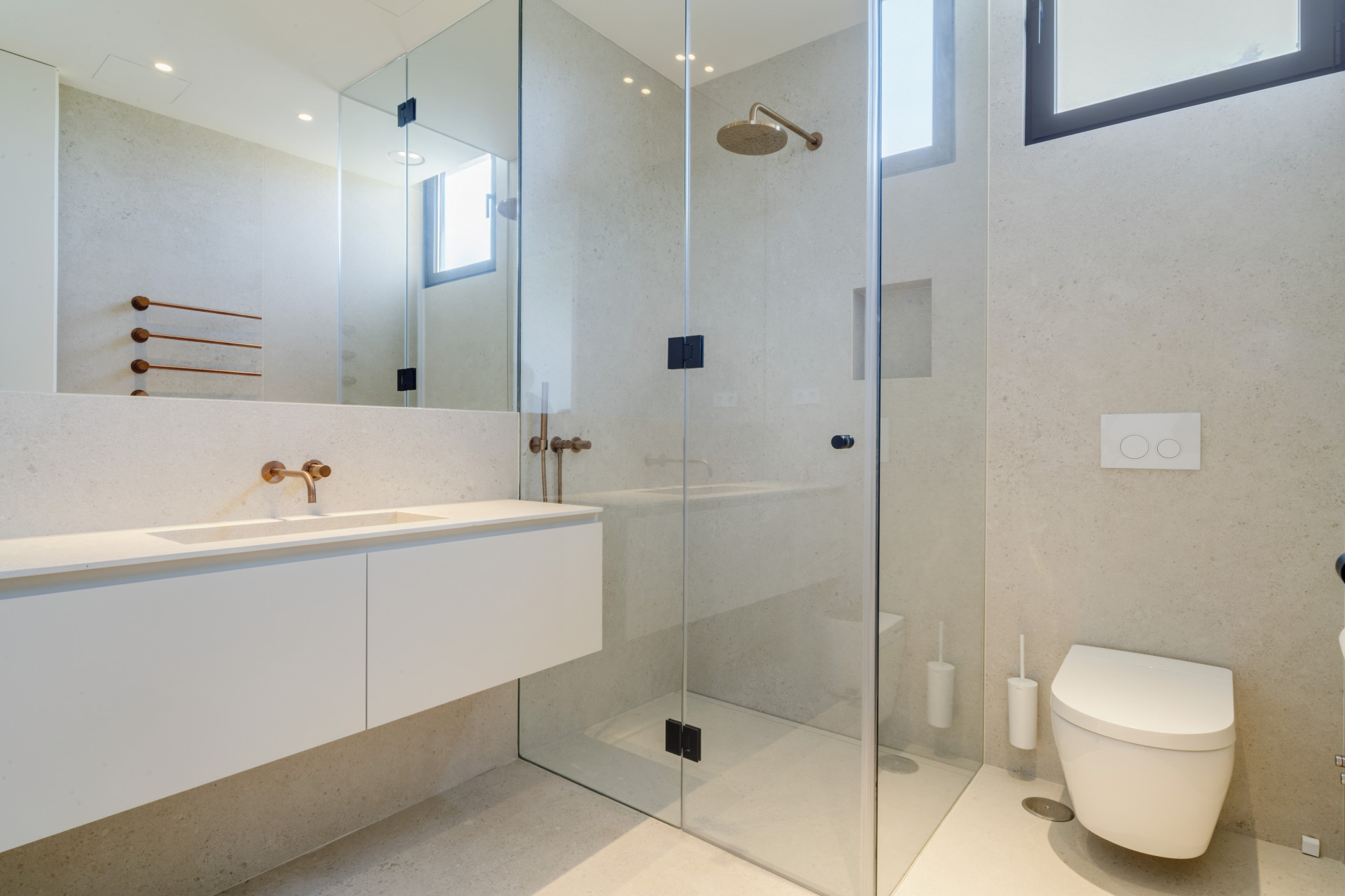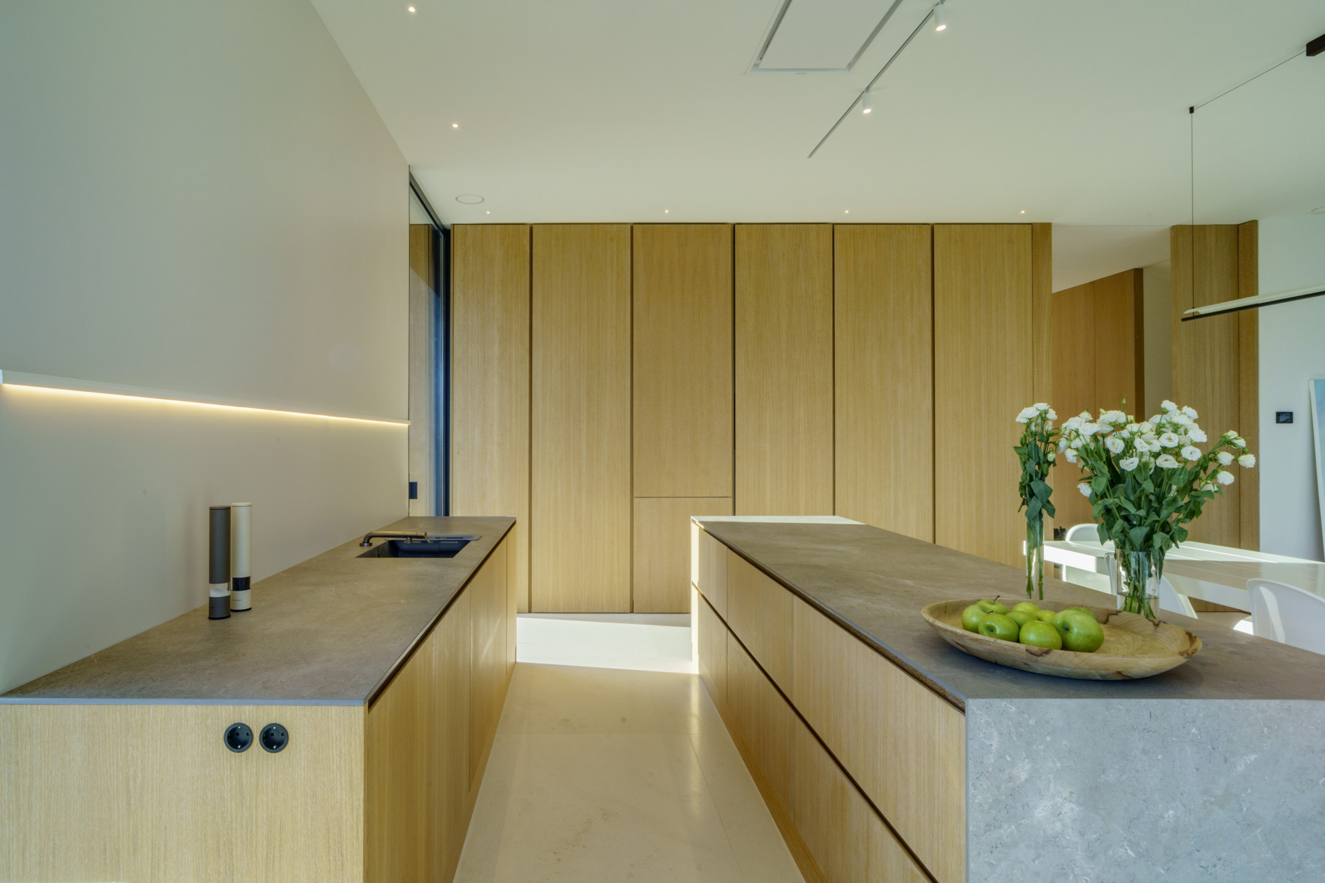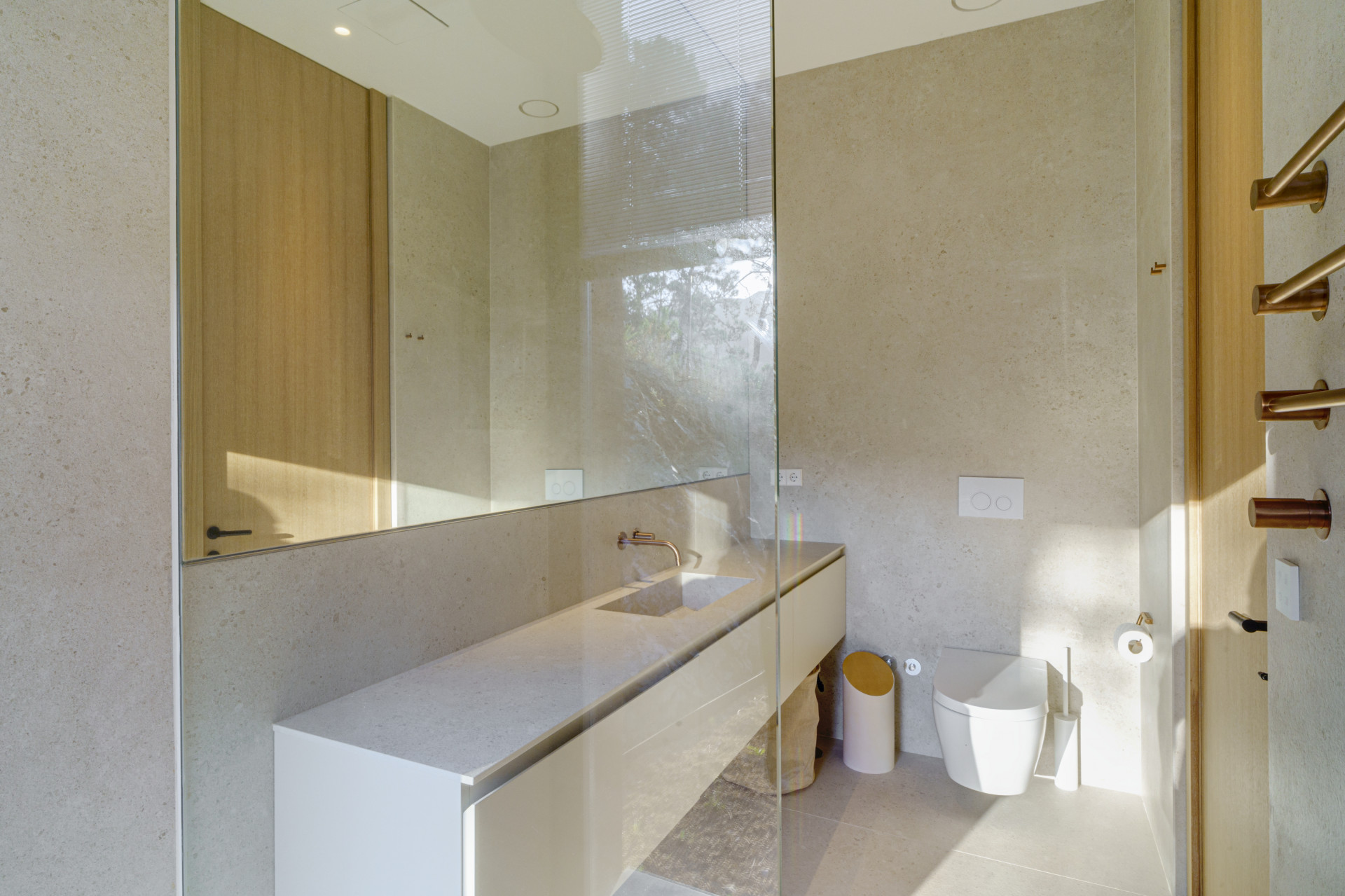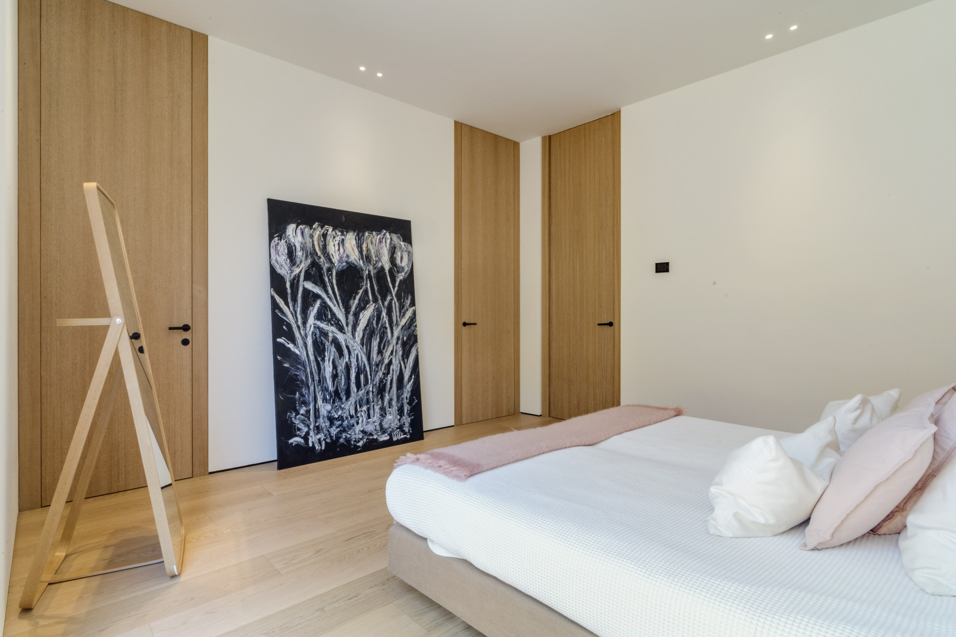 Spanning a generous built area of 602m² with a 200m² terrace on a 3,200m² plot, the villa is meticulously appointed to the highest standards. The interior features five en-suite bedrooms and a total of seven bathrooms, each fitted with Iconico fixtures and Iconic Smart WCs, as well as grand-format Inalco porcelain finishes. Natural oak carpentry is evident throughout, from the oversized pivoting entrance door to the custom wall panels, wardrobes, and a spacious walk-in closet. Bedrooms are adorned with Astorga oak parquet in large format, while living areas are finished in 120x120 Piedra Paloma natural stone, complemented by Technal windows of a remarkable 3.08m height. Comfort is assured with underfloor heating, aerothermics, air conditioning, and a fireplace, while advanced amenities such as a gym, Turkish bath (Hamam), fully equipped basement, and a dedicated office room cater to both relaxation and productivity.