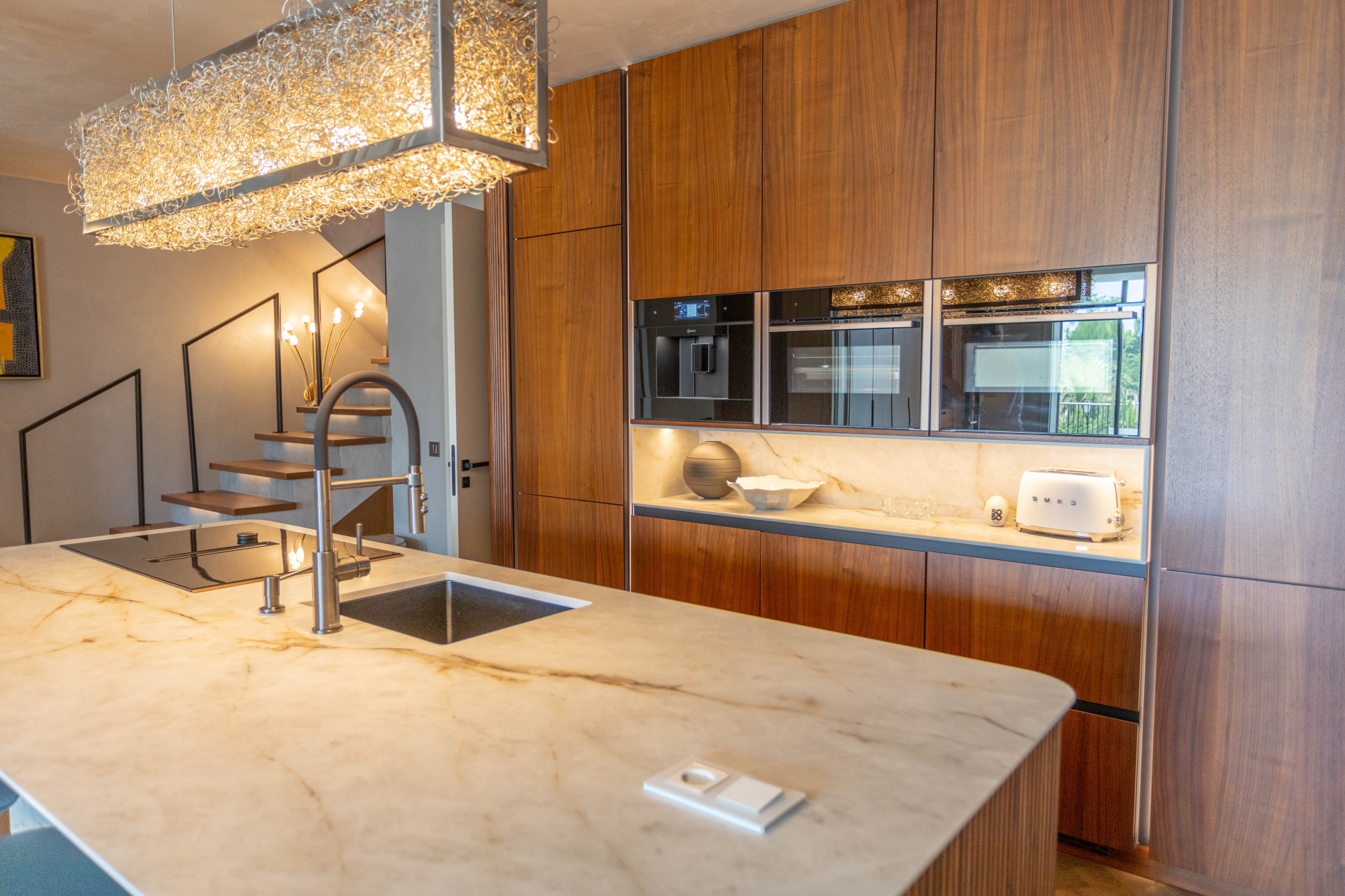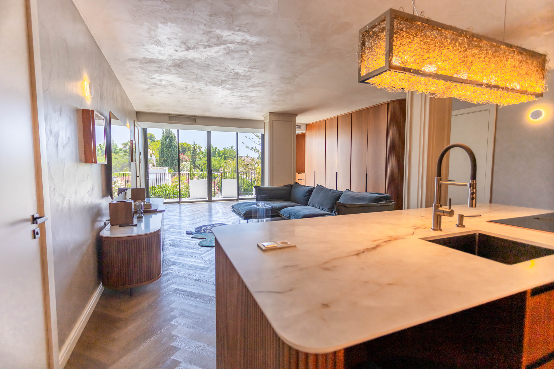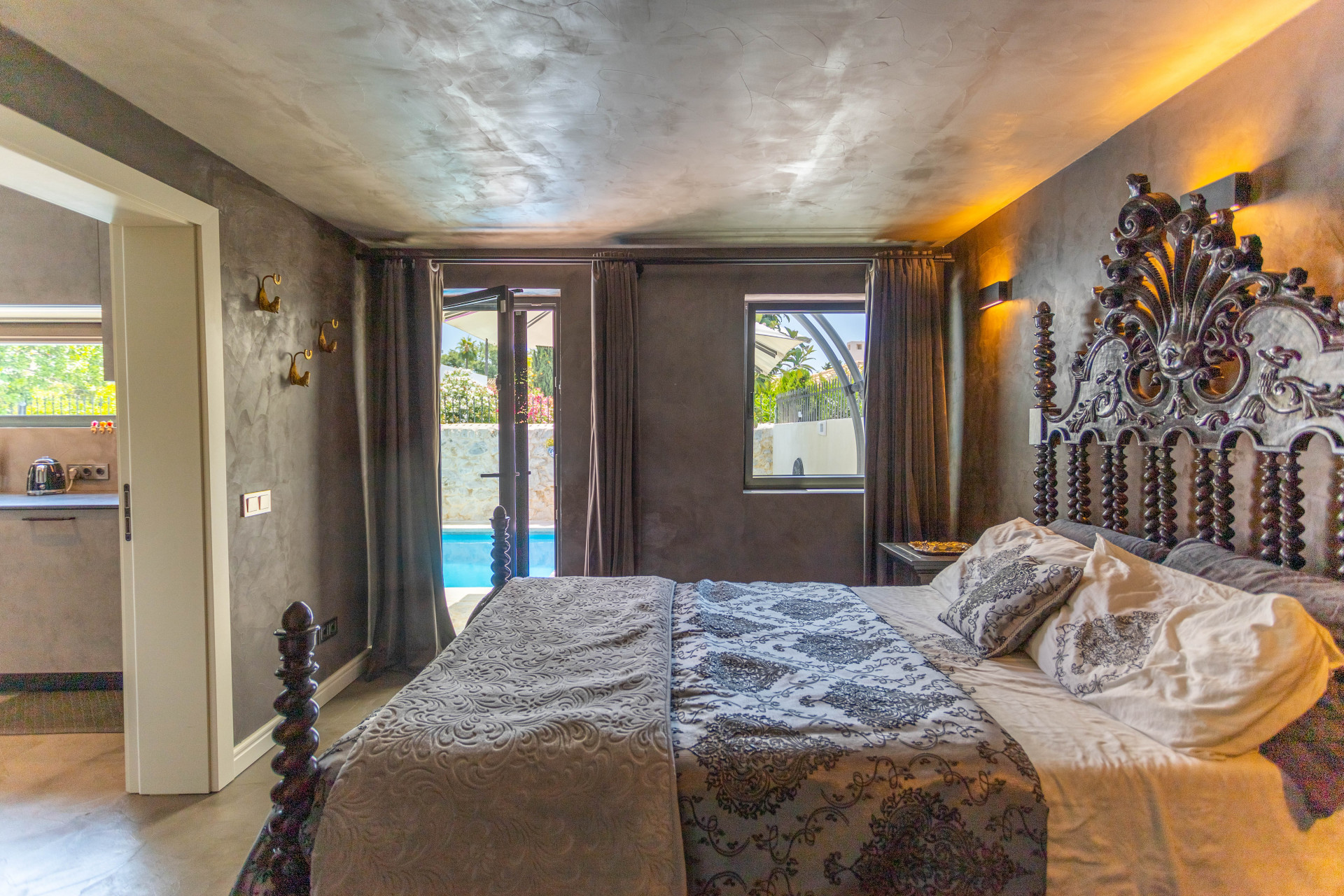 The villa’s layout is notable for its innovative distribution over three levels, purposefully crafted to accommodate two fully independent apartments. On the ground floor, an inviting and self-contained living area comprises an open plan kitchen, spacious guest bedroom with en suite bathroom, and direct access to the lush private garden and sparkling pool. This setup is ideal for visitors or extended family, providing them with comfort and autonomy. Panoramic and garden views, double glazing, and glass doors ensure a light-filled, tranquil atmosphere throughout.