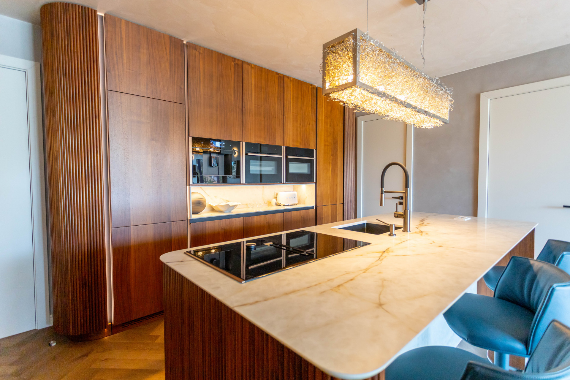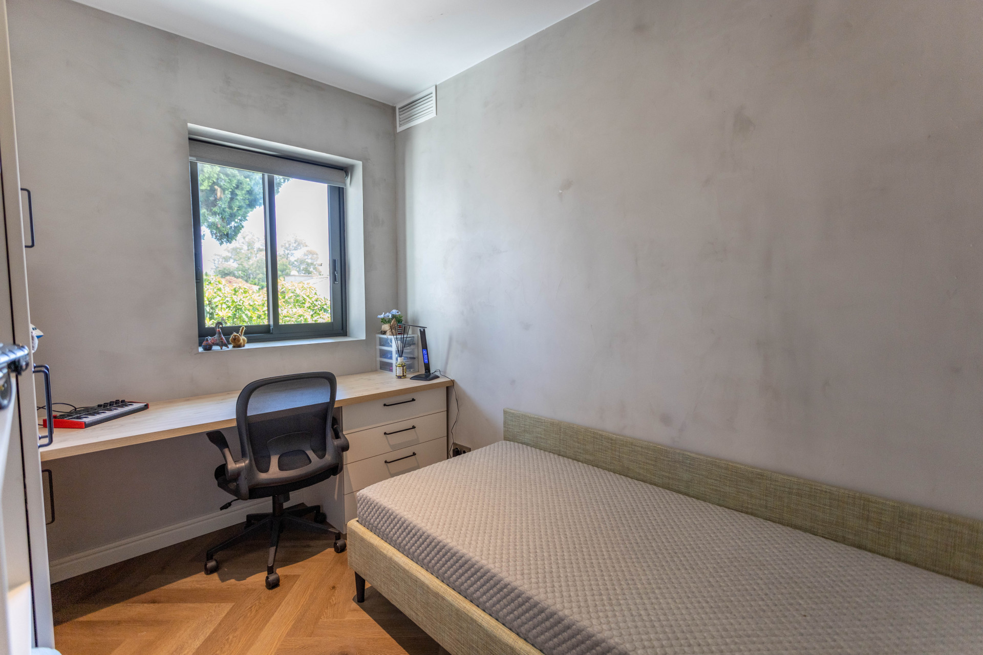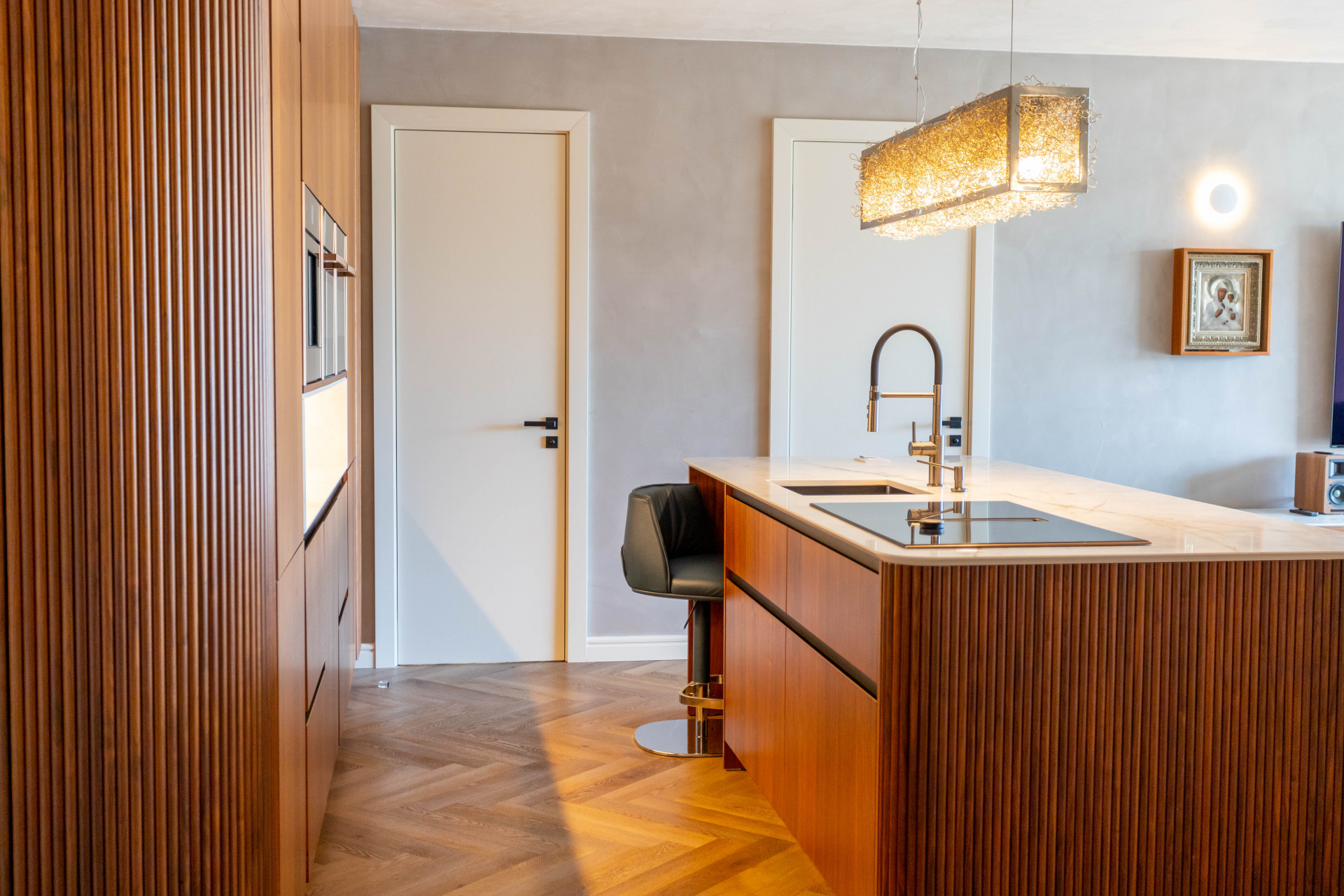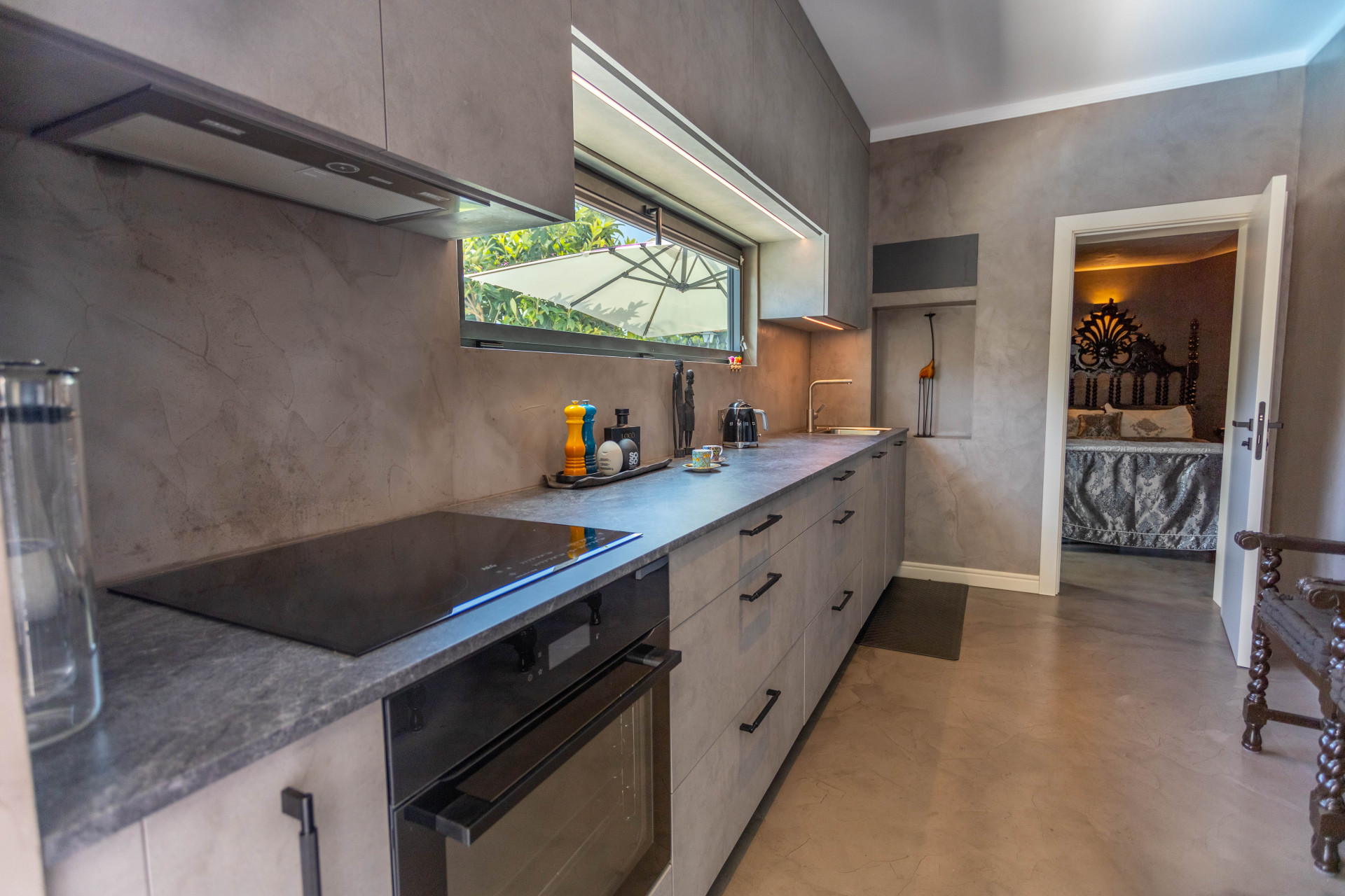 The villa’s layout is notable for its innovative distribution over three levels, purposefully crafted to accommodate two fully independent apartments. On the ground floor, an inviting and self-contained living area comprises an open plan kitchen, spacious guest bedroom with en suite bathroom, and direct access to the lush private garden and sparkling pool. This setup is ideal for visitors or extended family, providing them with comfort and autonomy. Panoramic and garden views, double glazing, and glass doors ensure a light-filled, tranquil atmosphere throughout.