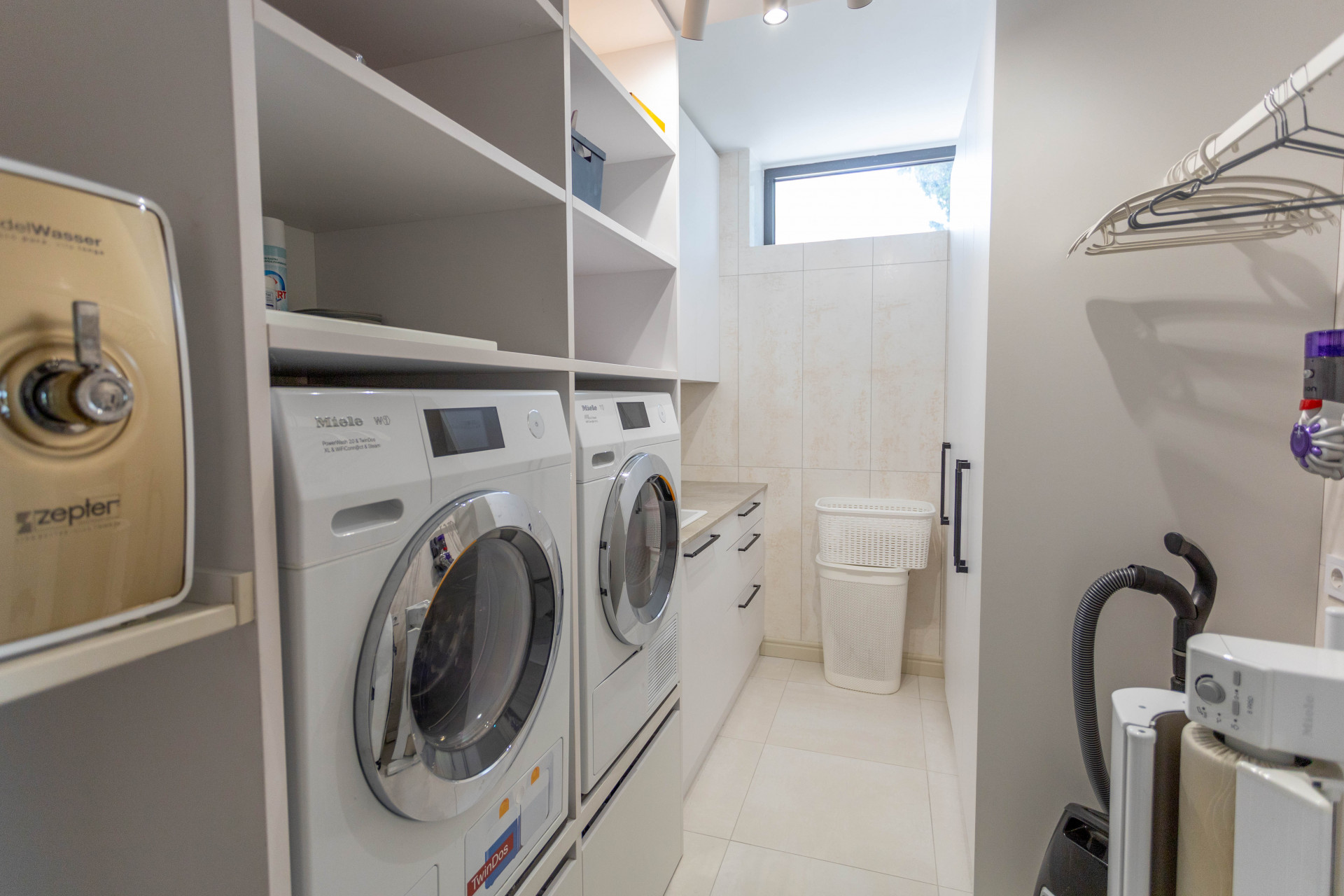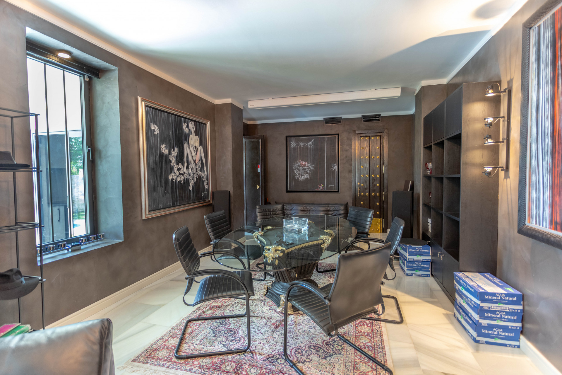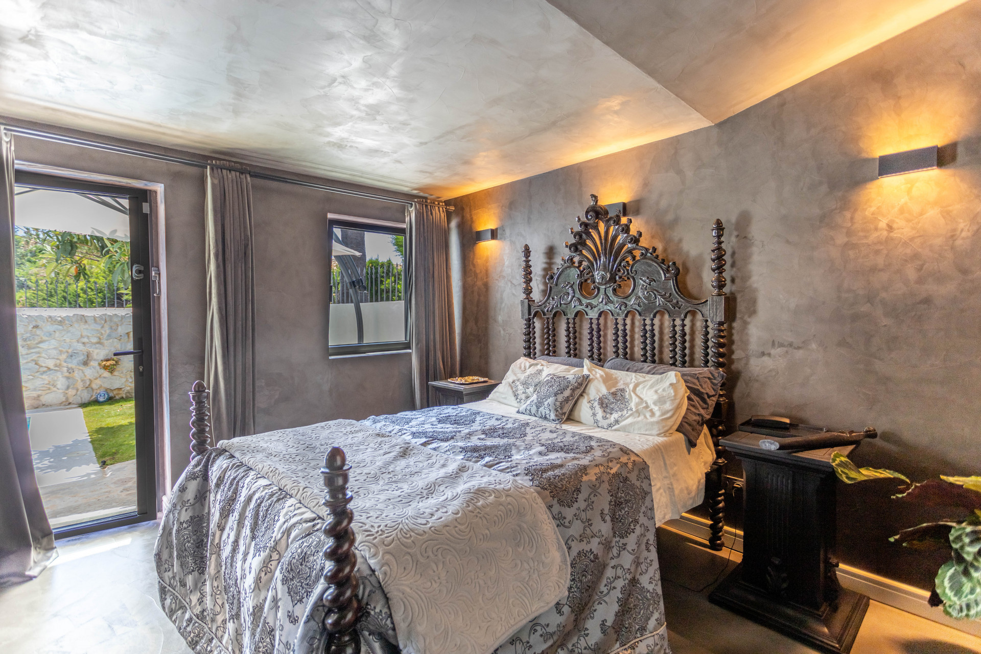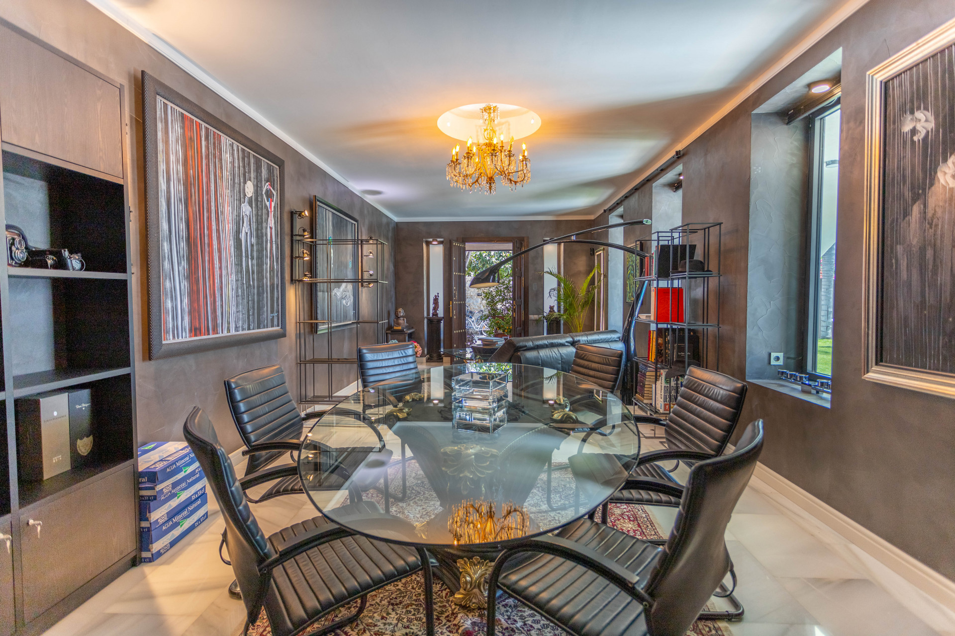 Ascending the grand staircase to the upper floor reveals a contrasting living experience, with a bright open concept living space, a contemporary kitchen, two further bedrooms, an office room, and a separate laundry area. Extensive terraces, both covered and uncovered, total 230m² and provide ample space for enjoying Estepona’s superb climate, perfect for entertaining or relaxation while taking in the serene garden and pool vistas.