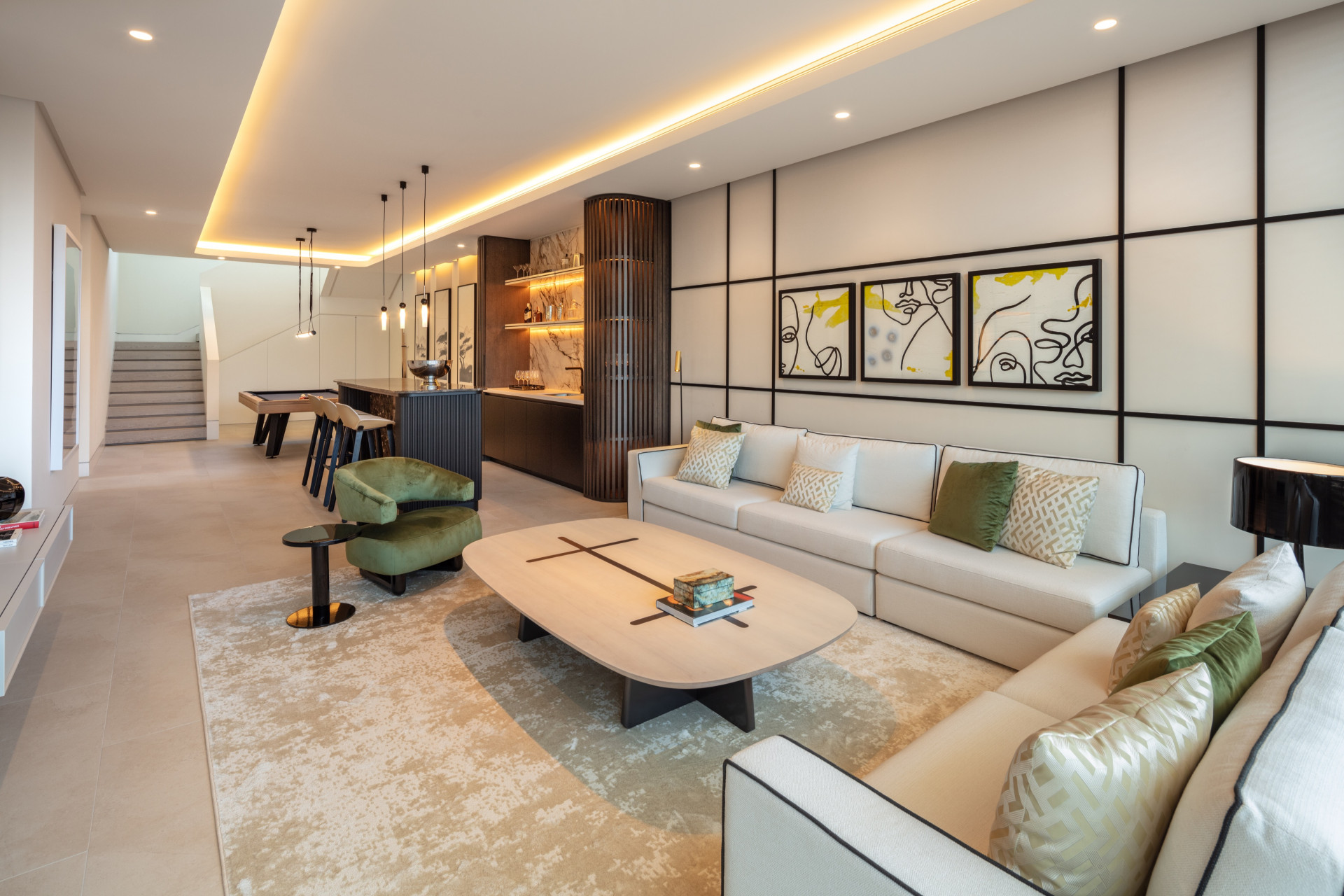 The villa is thoughtfully arranged over three levels. The main floor showcases open-plan living and dining areas, an ultra-modern kitchen, and access to multiple terraces for al fresco dining and lounging. All seven bedrooms are appointed with en suite bathrooms, offering comfort, privacy, and a touch of indulgence. The upper level features a lavish master suite with private terrace, while the lower level is dedicated to entertainment and wellbeing, encompassing a fully equipped gym, games room with bar, lounge area, sauna, cinema room, and an impressive wine cellar. Further amenities include a private pool with panoramic views, garden, garage, guest rooms, walk-in closet, smart home system, and underfloor heating in all bathrooms.